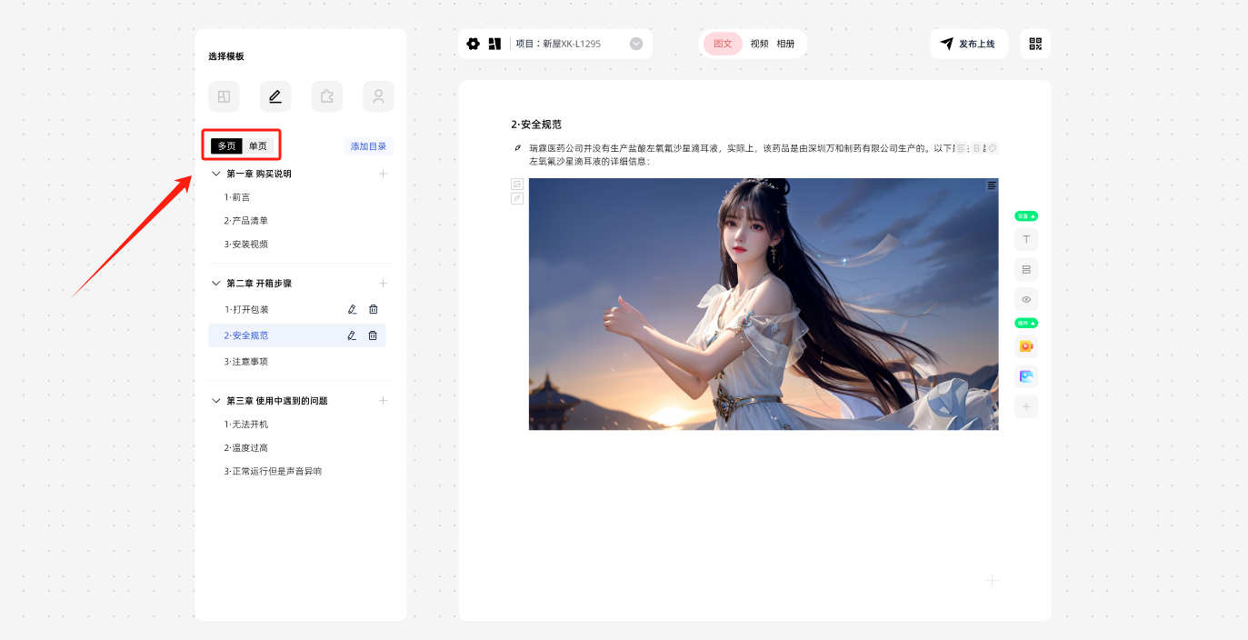 1 多页/单页: 可以根据自己的业务需求,进行单页多页的切换,两个的主要区别在于业务常见的不同,比如药品说明书、产品规格等内容相对比较少,会使用单页说明书。电器使用说明书,内容比较多,常用多页格式。