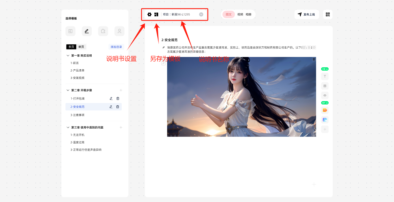 2 工具栏:设置/另存为模板 设置:可以更改说明书的配置信息;另存为模板:可以让用户将在编辑的说明书存为自建模板
