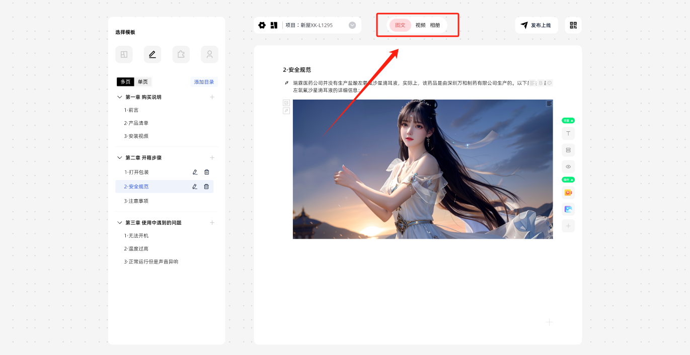 3 内容格式切换: 说刻支持在多页说明书中,每个页面都支持图文/视频/相册的格式使用,切换顶部工具栏即可实现不同的展示效果