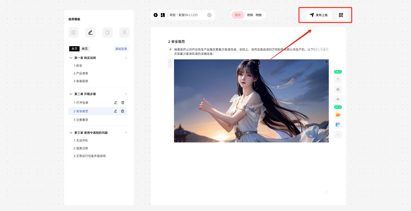 4 工具栏:发布上线/二维码 发布上线:用户点击后即可发布说明书上线 二维码:可以通过二维码在手机上预览,或者下载二维码粘贴在产品上
