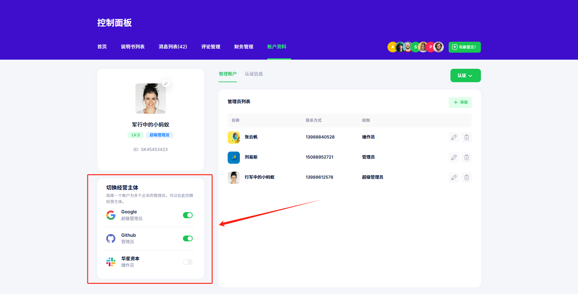 您可以先让他们注册企业账号,然后再用他们的账号,邀请你成为“管理员”即可,操作的时候在“账户资料”管理界面即可切换不同的操作主体。