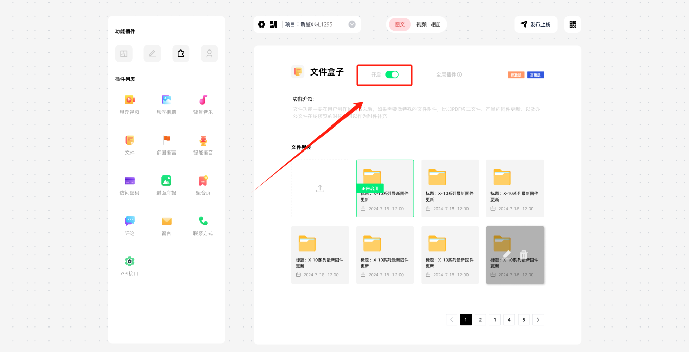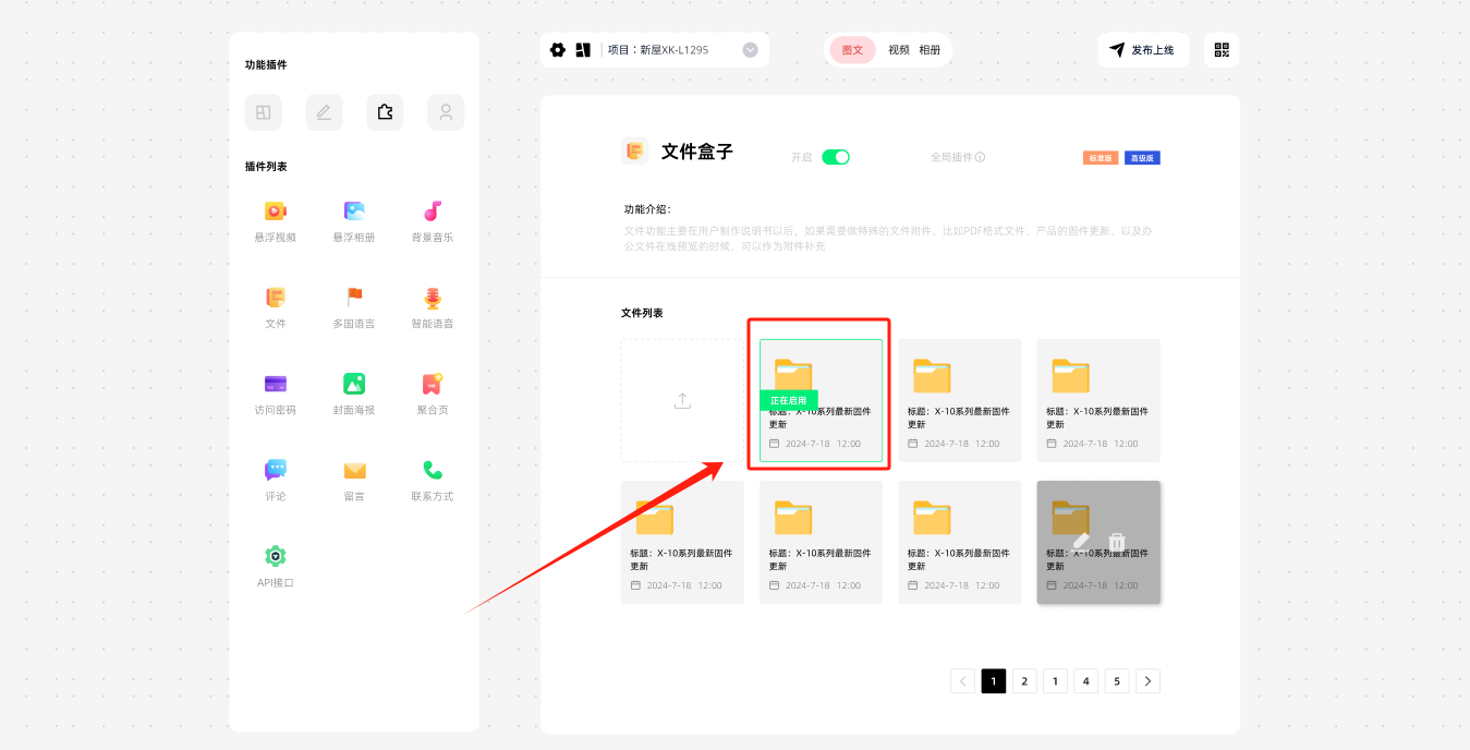 提示:文件盒子是全局插件,启用后将在所有页面都能够看到该插件。同一个文件夹,以后如果更新文件,则调用过的说明书即可同步调用该文件夹内容。