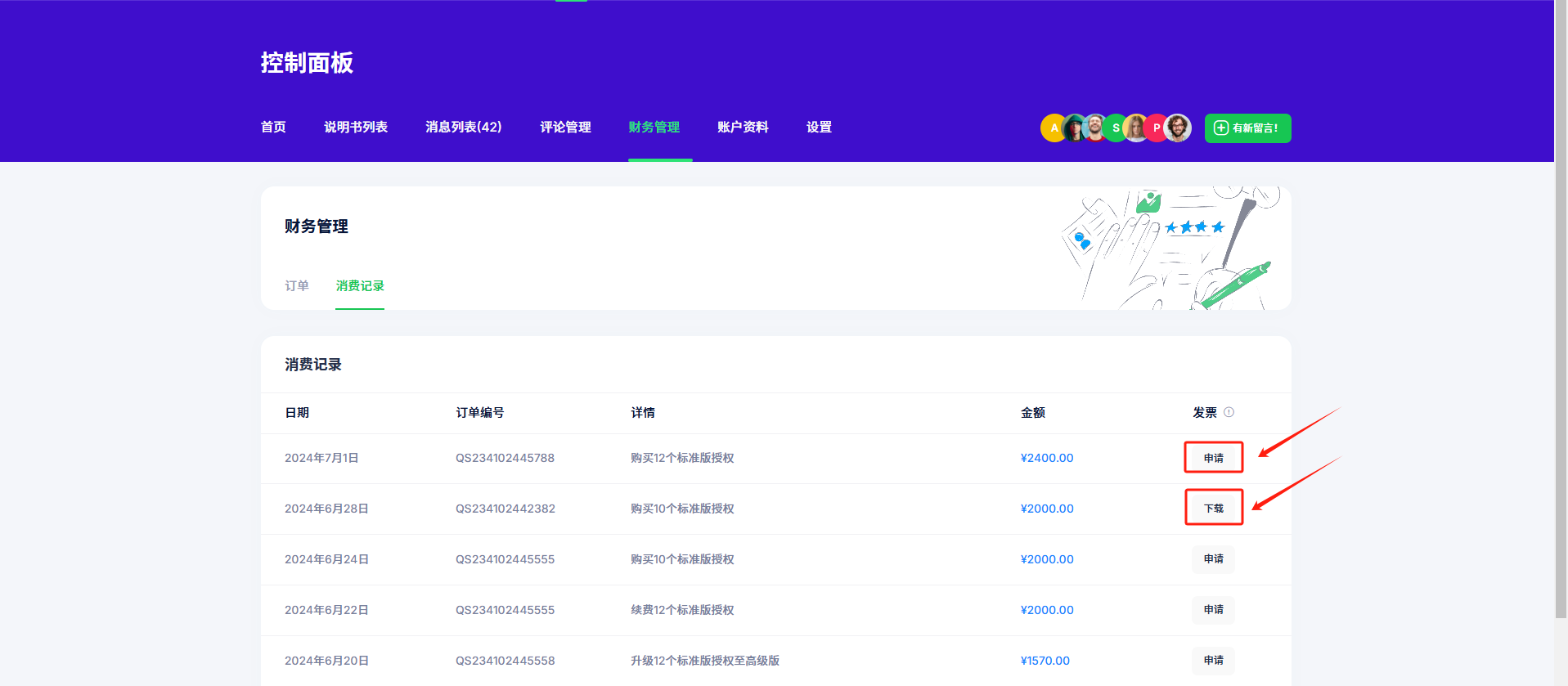 2 点击“消费记录”进行“申请”,申请成功后点击下载即可