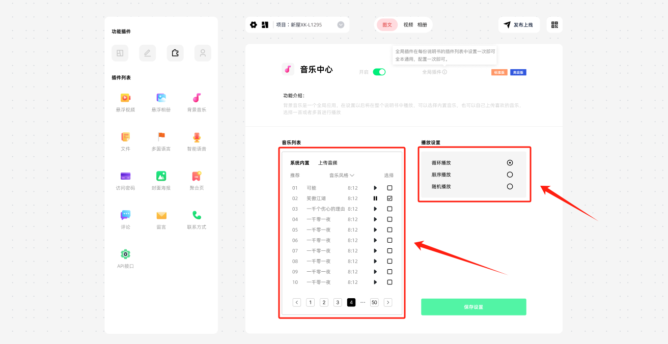 1 选择音乐: 选择音乐库中的音乐或者上传自己的音乐并选中
