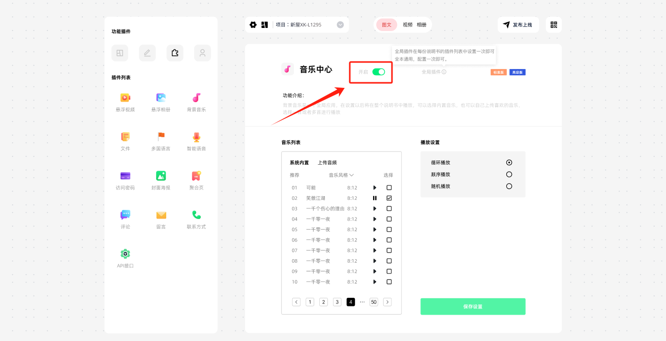 2 开启该功能: 即可在说明书的所有页面当中使用该音乐作为背景音乐